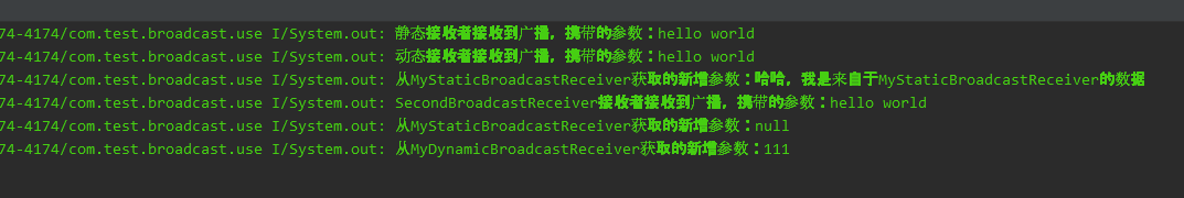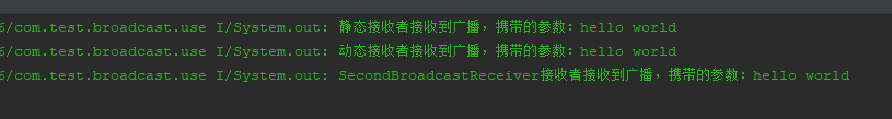 运行程序,点击发送广播按钮,得到以下输出。可以看到,成功收到广播消息
