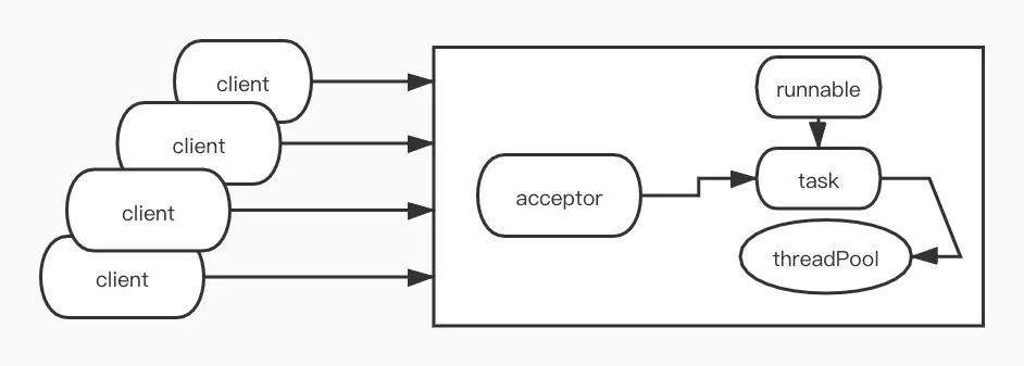 在传统BIO模型的基础上,用线程池来处理客户端的请求,防止高并发导致的server端资源被耗尽问题。