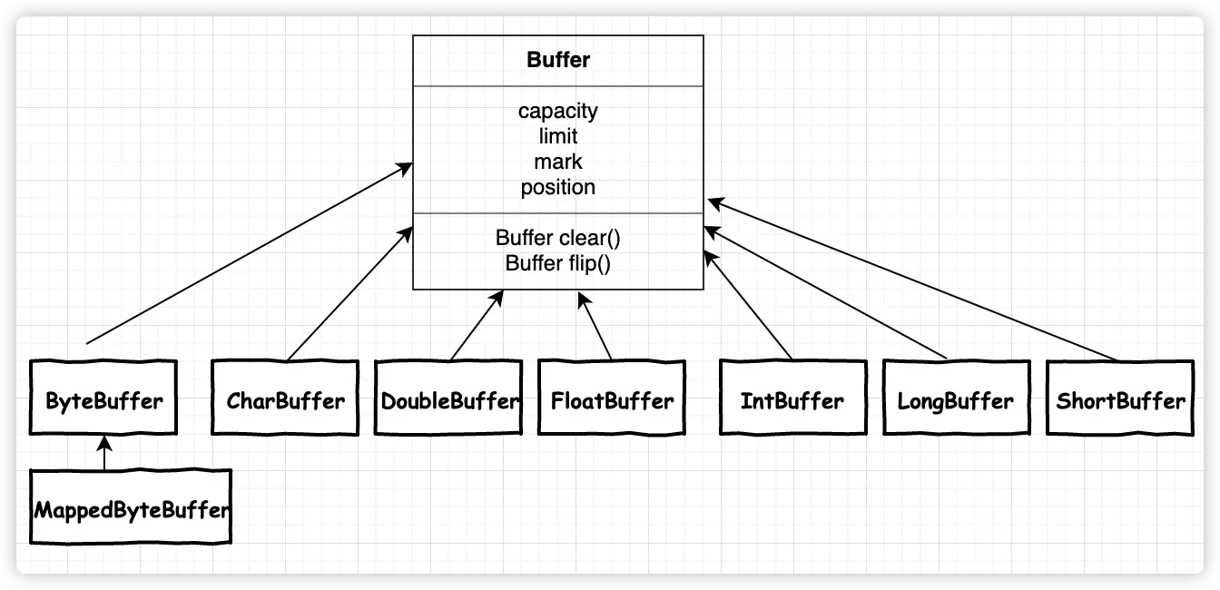 传统的BIO主要是面向流的,可以将数据直接写入或者读取到Stream对象中;而在NIO中,读取和写入数据都是在缓冲区中处理的,任何时候访问NIO中的数据,都是通过缓冲区进行的。最常用的缓冲区是ByteBuffer,常用的缓冲区还有下面几种: