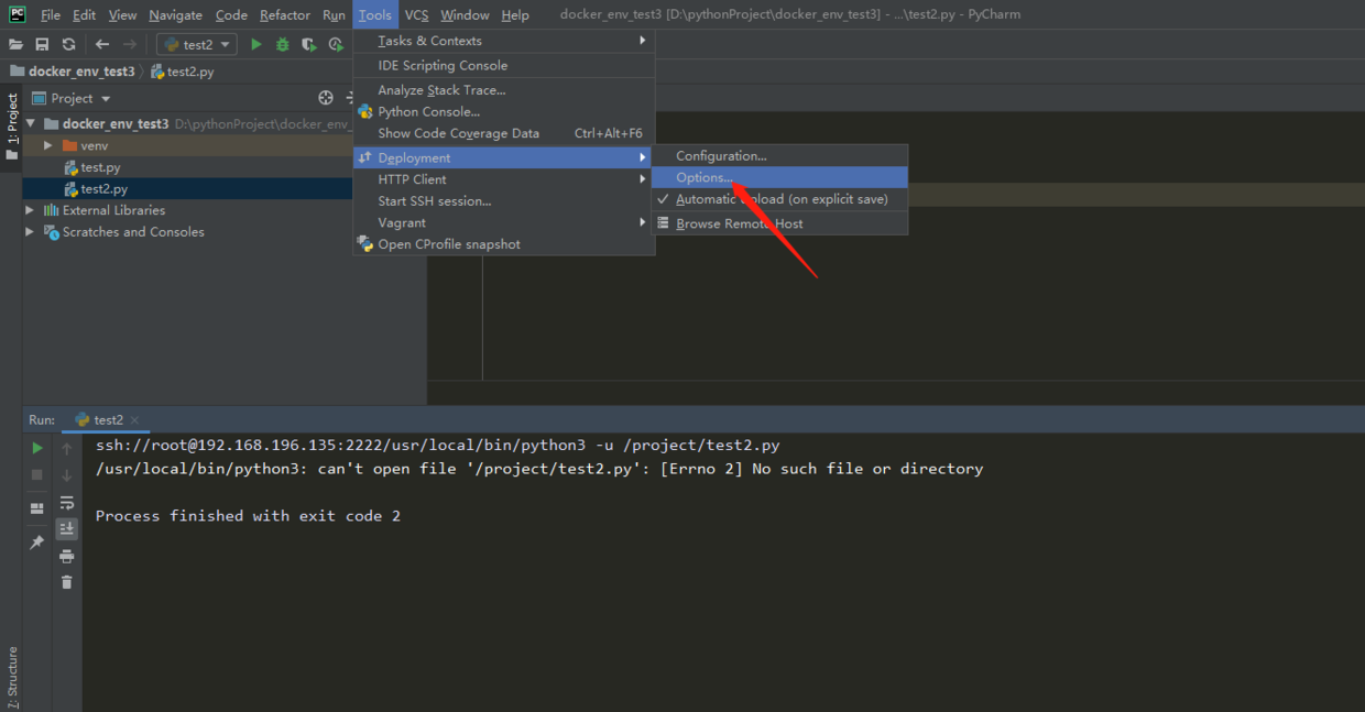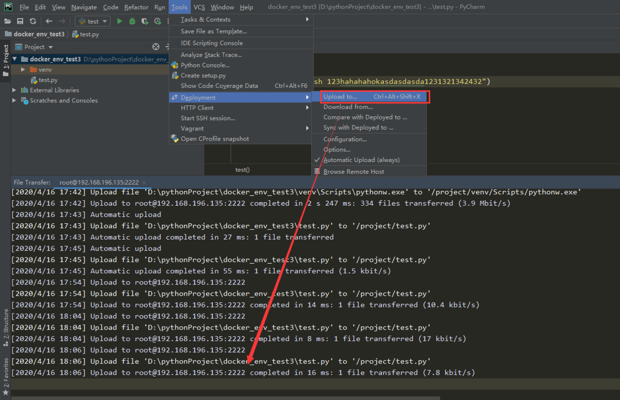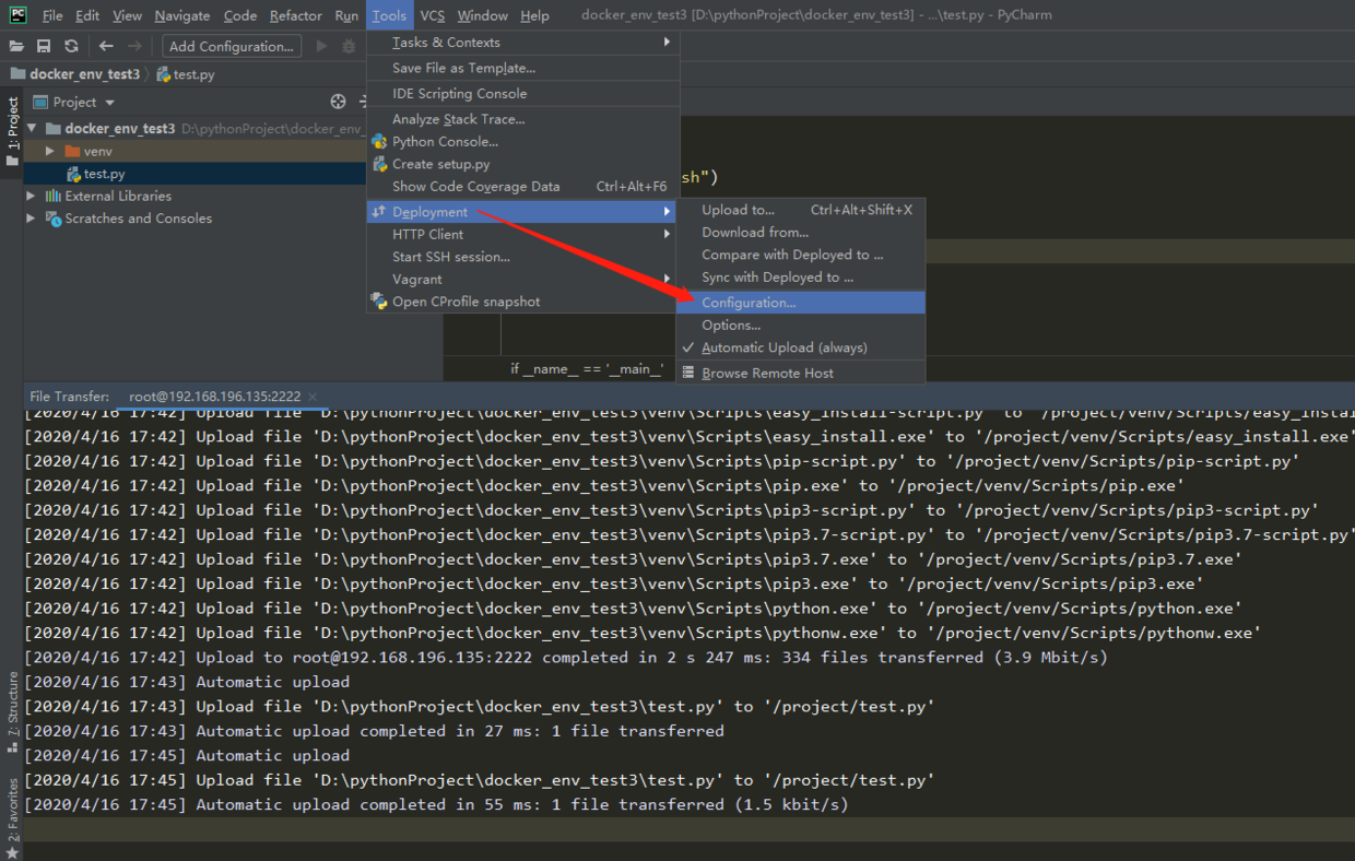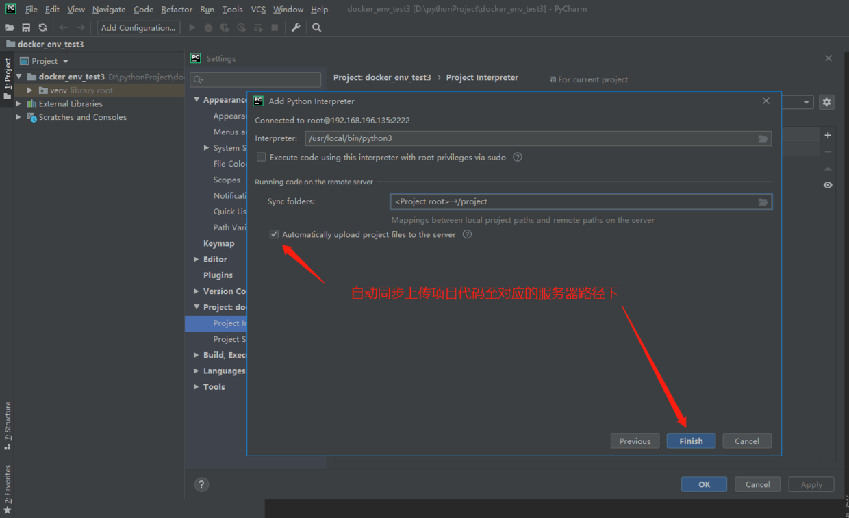 - 配置Pycharm自动同步项目的代码文件至python_env容器中,用于调试代码