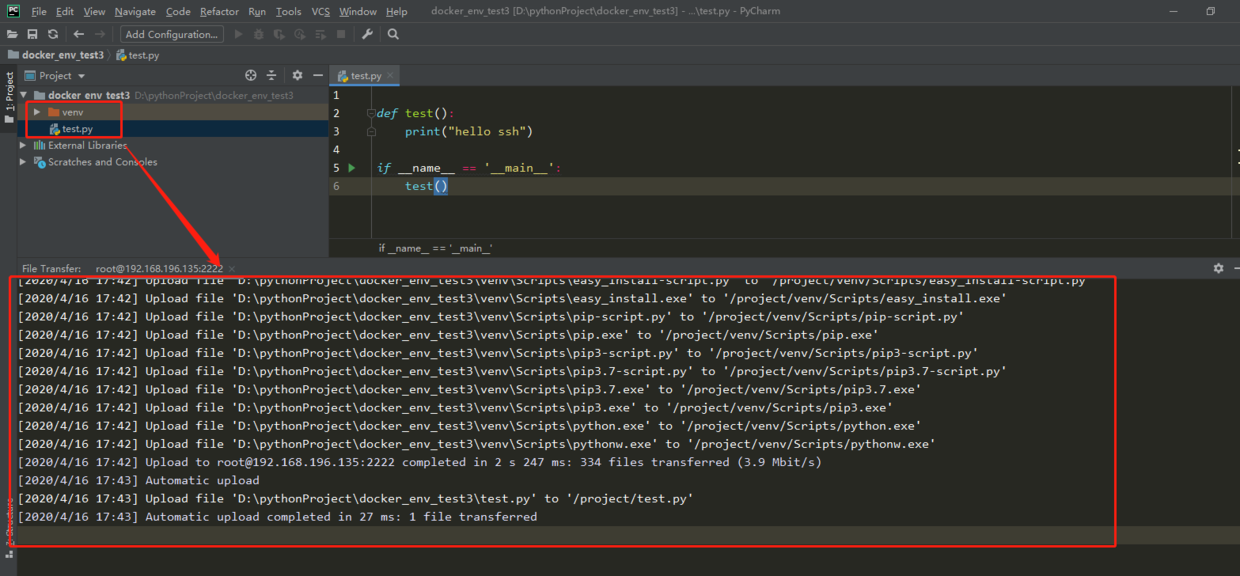 创建一个python脚本,点击执行,那么pycharm则会发出一条ssh的命令,将远程执行的信息同步回来展示。
