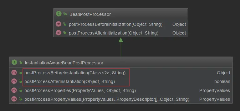 before和after方法;那有没有在bean创建前后执行的接口方法呢?答案是肯定有的,这个功能是由BeanProcessor的子接口InstantiationAwareBeanPostProcessor来实现的,他也是有before和after方法,会在bean实例化前后执行。