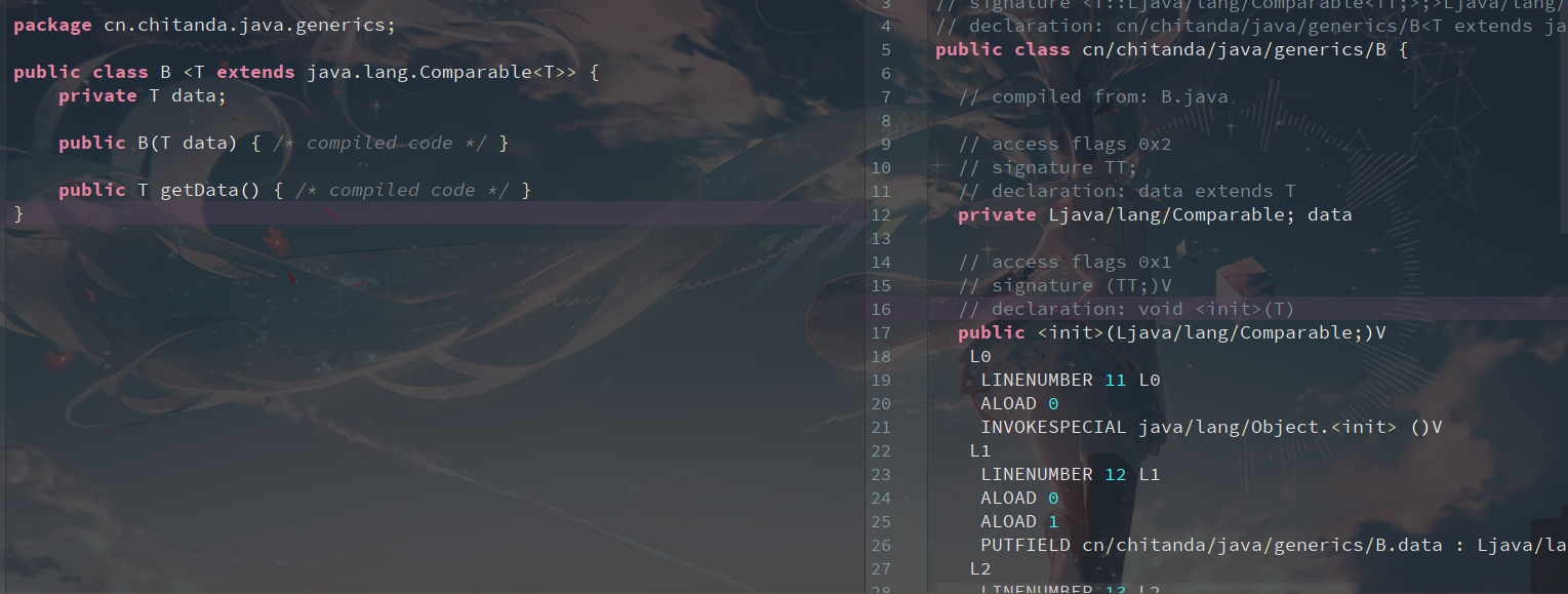 左边class文件里还是T,其实是签名而已.保留了定义的格式,便于分析字节码.右边的才是对应的参数类型.方框中的是泛型类独有的标记,普通类没有,标记了定义时的成员签名(泛型参数列表,参数类型,返回值等)