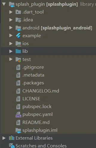 可以看出插件和Flutter工程其实一样,目录中就多了一个example (示例测试工程可用于插件的调试)。我们写插件的话,一般 代码写在 android或者ios下,Flutter代码写道lib下,其实和Flutter与Native通信一样,相当于你封装了功能,外部调用而已。