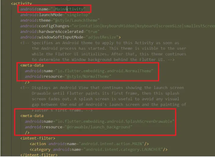 public SplashScreen provideSplashScreen() { Drawable manifestSplashDrawable = getSplashScreenFromManifest(); if (manifestSplashDrawable != null) { return new DrawableSplashScreen(manifestSplashDrawable); } else { return null; } }还记得之前的AndroidManifest.xml 中的 meta_data 配置吗,getSplashScreenFromManifest 方法就是将 launch_background.xml (默认白的,这也就是出现白屏的问题) 转换成Drawable,主要是用来做闪屏背景图的,这里仅仅是获取到了闪屏Drawable,如果没有呢?没有那么这个闪屏页不就没有了么?那就是说启动的时候连闪个白屏都会不给机会,直接给黑屏。那么什么时候会没有,也就是meta_data啥时候会没有配置,创建flutter_module的时候就没有配置。