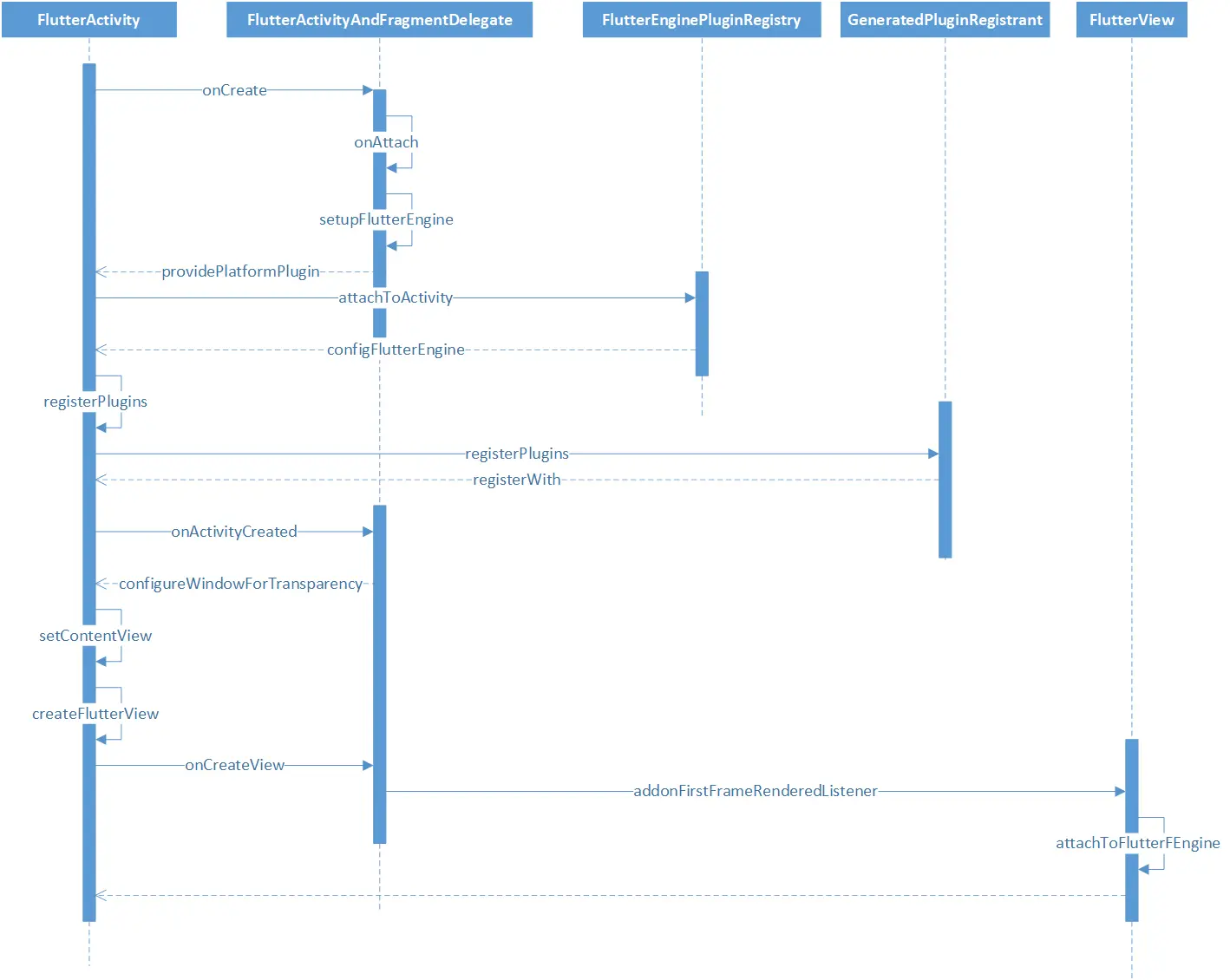 private final FlutterView.FlutterEngineAttachmentListener flutterEngineAttachmentListener = new FlutterView.FlutterEngineAttachmentListener() { @Override public void onFlutterEngineAttachedToFlutterView(@NonNull FlutterEngine engine) { flutterView.removeFlutterEngineAttachmentListener(this); displayFlutterViewWithSplash(flutterView, splashScreen); } @Override public void onFlutterEngineDetachedFromFlutterView() {} };listener里的 displayFlutterViewWithSplash 是干嘛的呢?主要利用背景图 DrawableSplashScreen 生成一个ImageView对象,并设置500毫秒透明度渐变的动画,然后这样第一帧绘制完毕后再将这个闪屏页删除。但是这个 listener的 onFlutterEngineAttachedToFlutterView 方法什么时候会调用呢?