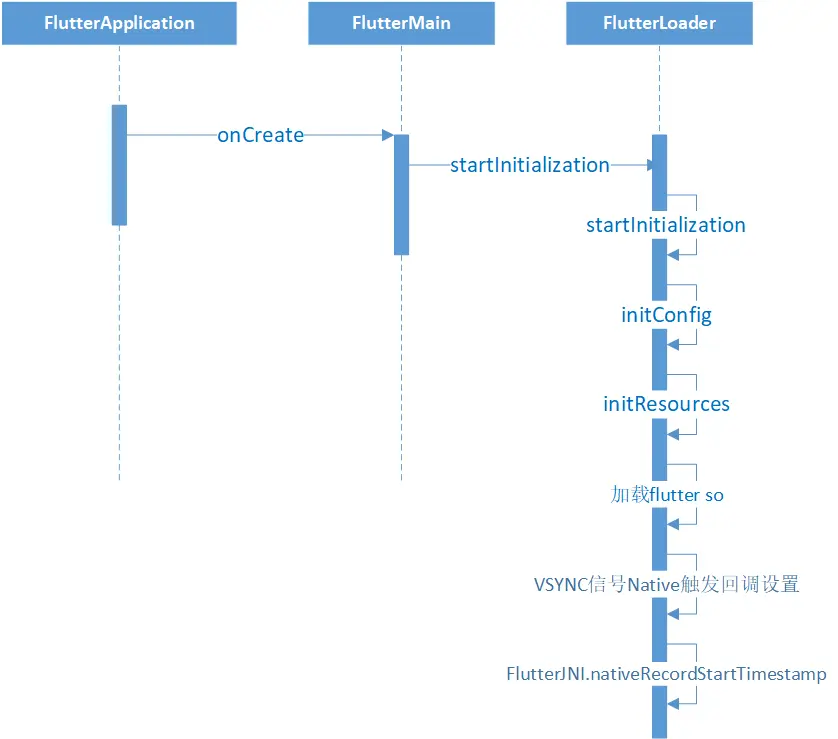 Flutter App 启动流程,会先执行FlutterApplication的onCreate方法,初始化meta_data的配置,在调试或者JIT模式下,拷贝asset目录下的相关资源到flutter私有目录下,加载flutter so库,设置VSYNC信号回调给Native触发,初始化完成后通知Native耗时时间。