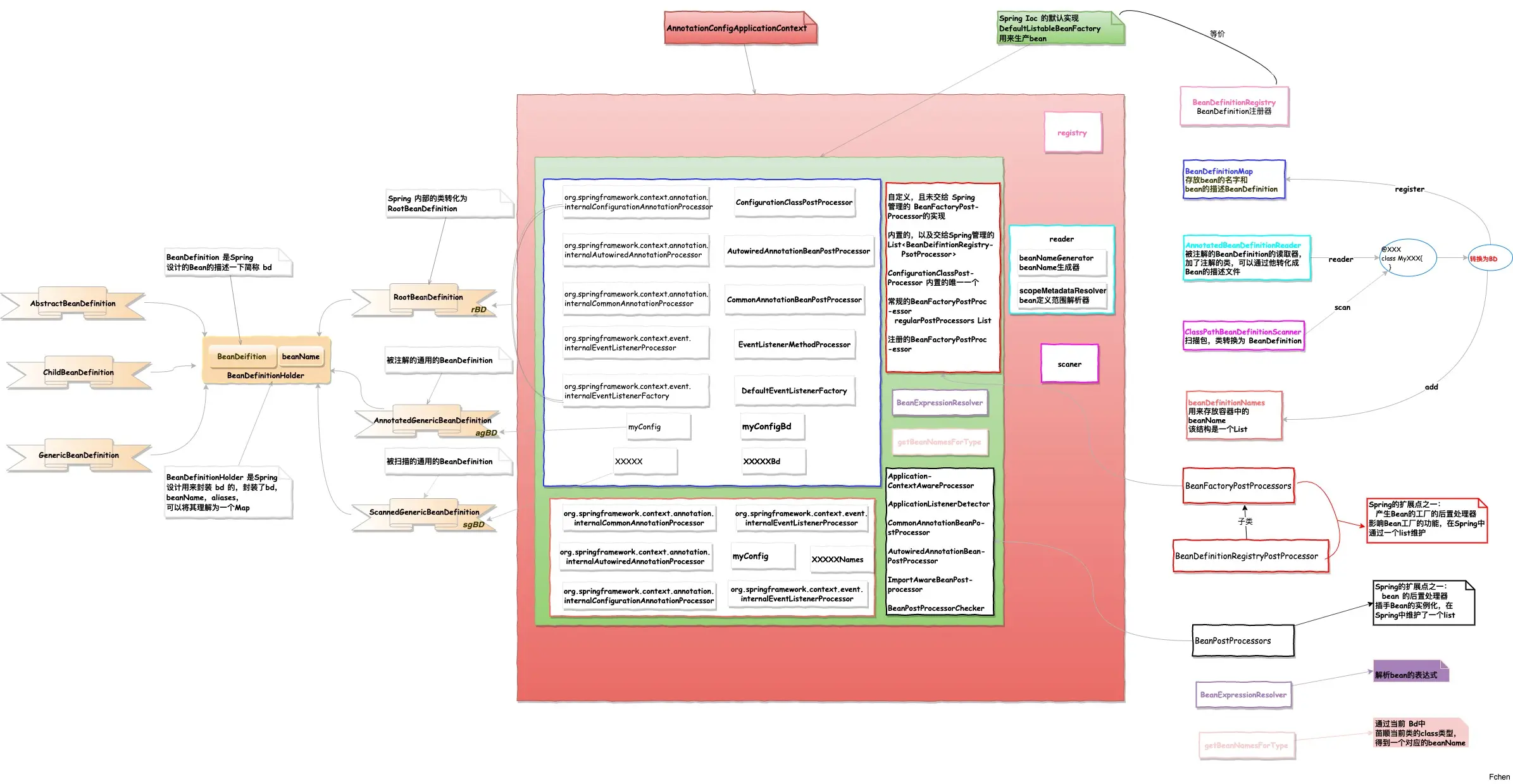 至此,Spring 中容器初始化不部分的解析已经处理完了,到目前为止,容器的中的东西基本上已经齐活了,通过下面的容器形成图示例: