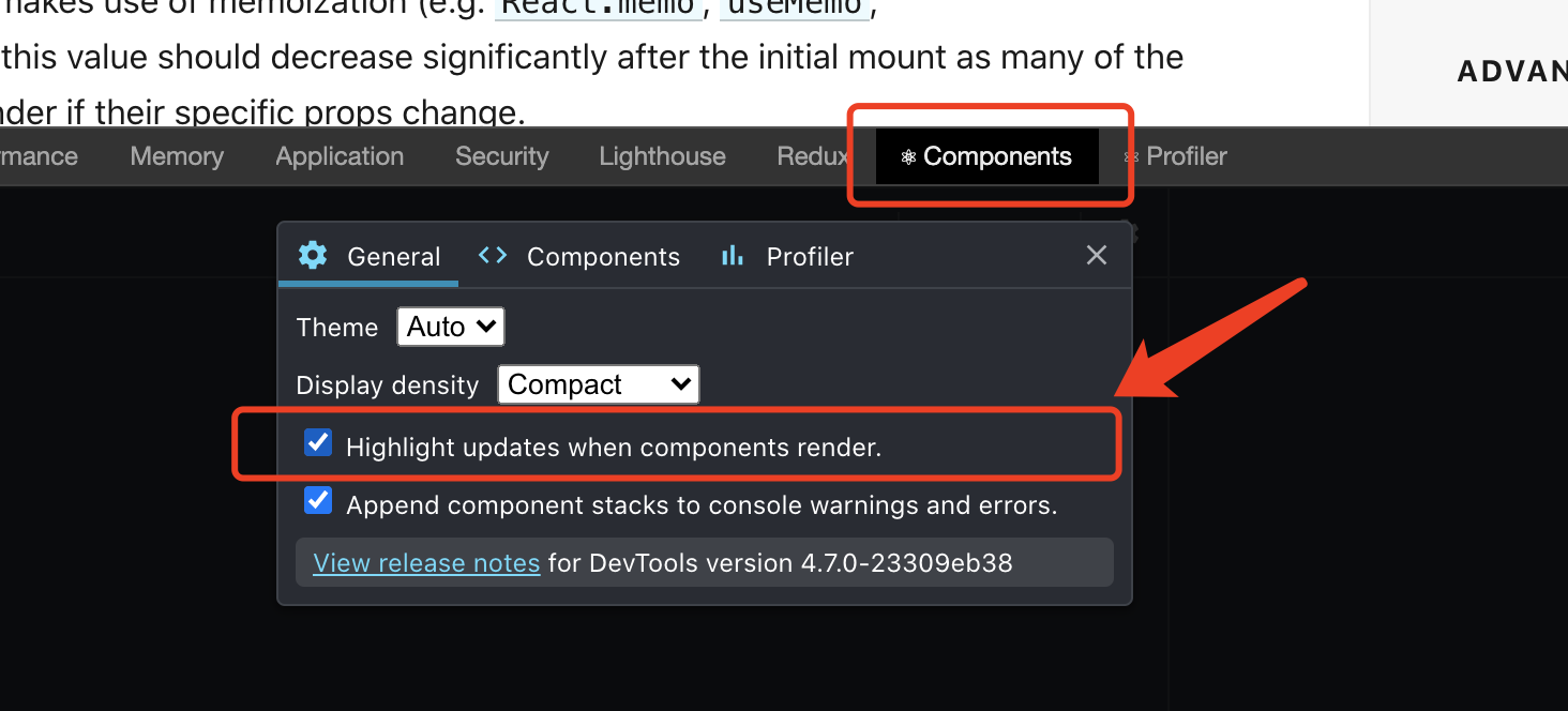 如何激活这个特性呢?找到调试工具的 Components 一栏,点击右上角的小齿轮,再选中弹窗中的 Highlight updates when components render.