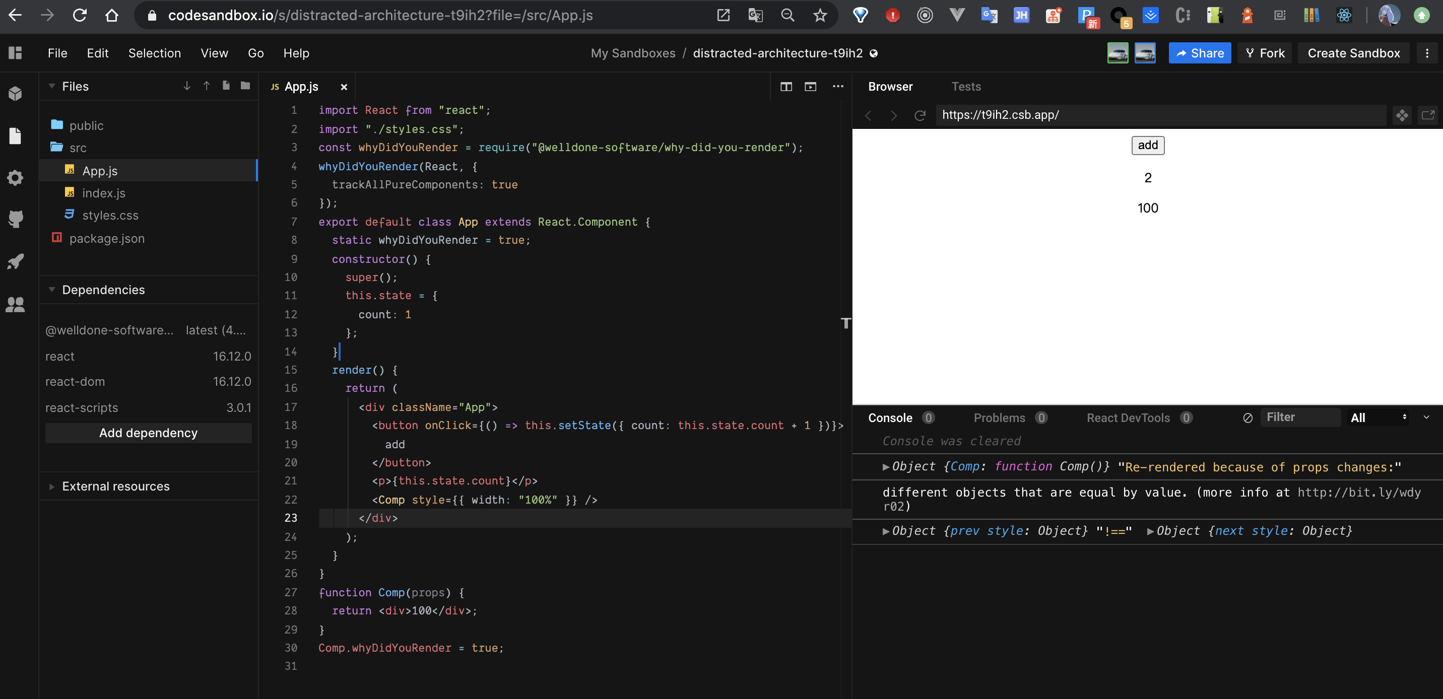 下面是一个完整的例子,每次 setState 时候,style={{ width: "100%" }} 都是一个新的值,所以会触发比对。