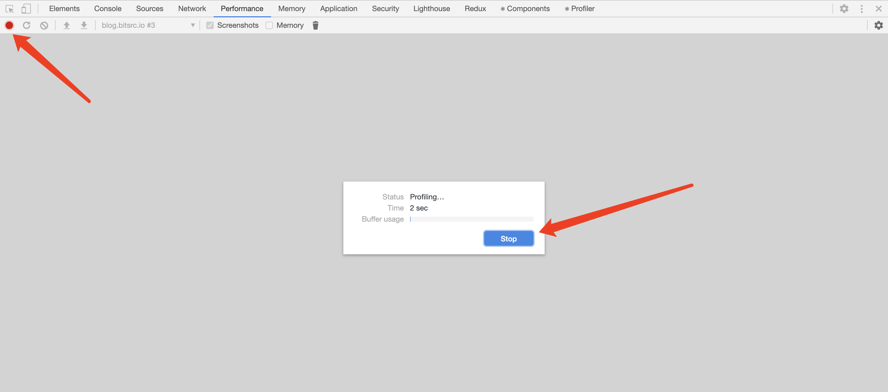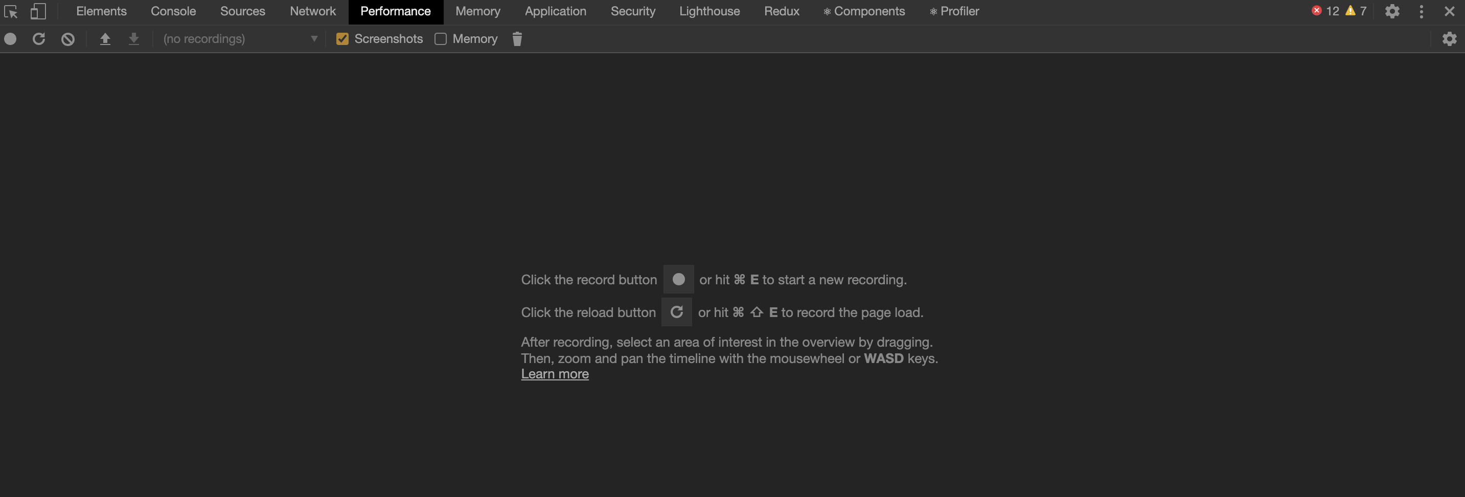 点击中间的圆点或者用快捷键 command + e,开发者工具就开始录制了,然后你可以在你的应用中做一些交互动作。