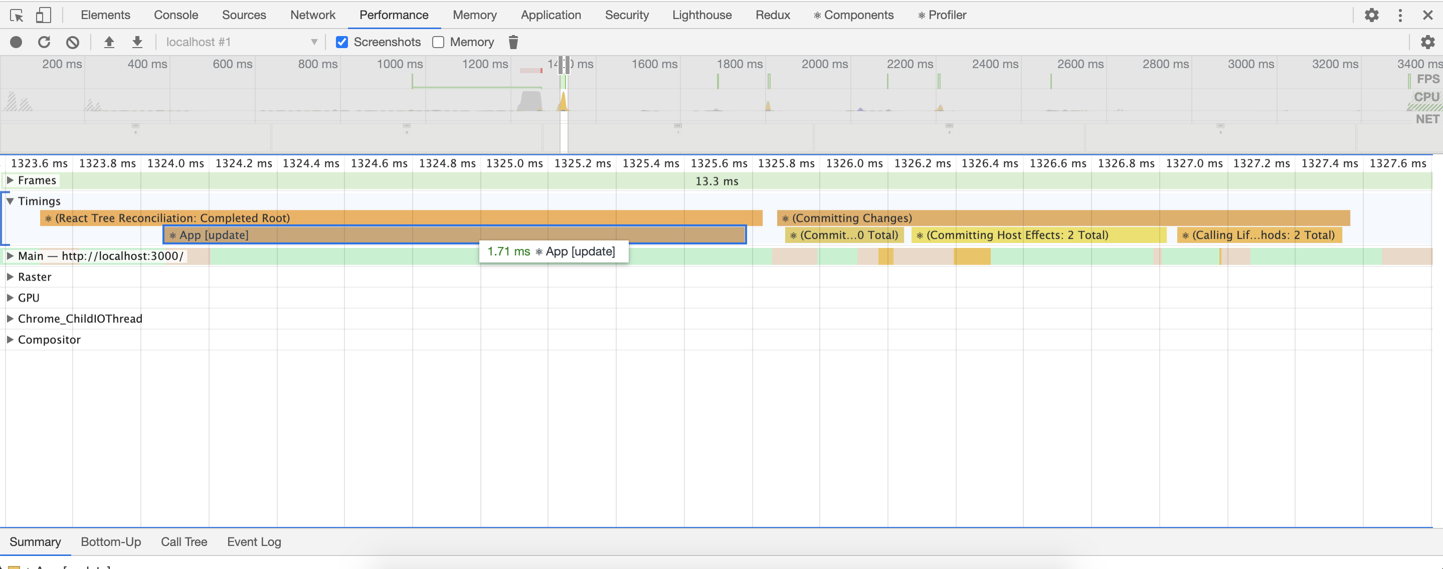 组件每次渲染的时候一个新的黄条就会生成,如果一个组件多次渲染,通过这个 Timings 图表可以让你更容易追因。每个黄条的长度表示组件的执行时间,黄条越长,执行时间也越长。你可以使用这个工具来诊断页面。