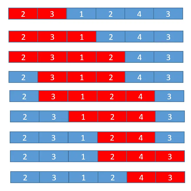 定义两个指针i,j分别指向0,1;其和 sum = 2 + 3 < s = 7,所以让 j++,直到其 sum >= s;如图第三个表格中,其和 sum = 8 > s = 7,此时记录 res = 4,并让 i++;如图所示,依此类推 就可以获得 res = 2.