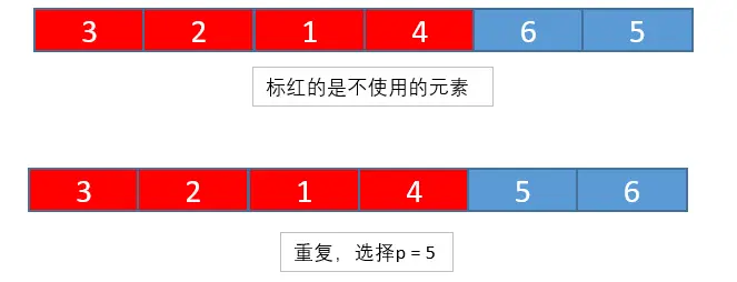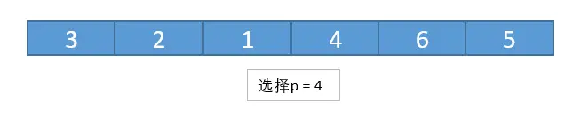 算法思路:随机在数组中找出一个数p,将数组中大于这个数p的元素放在右边,小于p的放在左边,如图