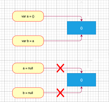 {}被变量a和b所引用时,其不会被销毁,而当将引用断开,即将a和b都置为null,此时,{}就是在一个不会被用到的内存里,无法再与任何一个对象建立关系,下次垃圾回收会将其回收。