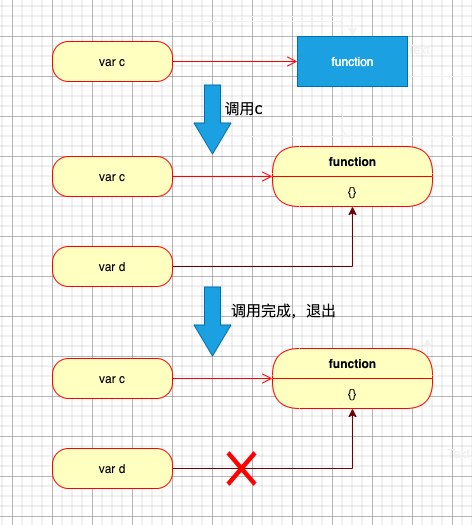 第二部分中,函数作用域中的变量d在调用完成之后,就不会再被用到,下次再调用函数时,会创建一个新的变量d,所以函数每次执行完退出,其所创建的变量d也应该在下次垃圾回收时被回收掉。