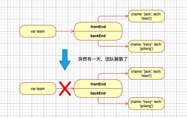 以上例子中,开始,一个团队中有两个技术人员,一个前端和一个后端,他们互为搭档,所以互相引用,同时,他们都是团队中的一员,被团队所引用。突然有一天,团队解散了,处理完赔偿相关事宜,team被置为null,也就是,这两人再也和团队没关系了,即使现在两人之间还互现存在引用,但是在当前环境中,已经没有任何变量在引用他们,所以在当前环境里他们也成了“垃圾”。