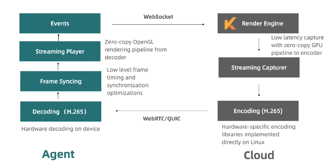 Kraken也在云渲染上作出了架构设计。将应用分离为客户端和服务端,通信使用WebSocket和WebRTC。简单来说在服务器上渲染之后,以视频流的形式传送给客户端。客户端捕获用户的操作,传送给服务端。如果网络达到了足够高的水平,就可以流畅的使用未来的新架构。这个和现在浏览器渲染是不一样的。浏览器渲染仍然是大量倚靠客户端的性能,而云渲染是将视频流发送给客户端,性能消耗就会很小。