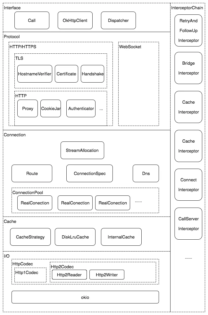 OkHttp的几个重要部分讲解就到这里全部结束了。回顾一下,我们从网络的同步/异步请求,降到它的拦截链模式。然后着重讲了几个重要的拦截器:cacheIntercepter、ConnectInterpcet和CallServerIntercepter。这几篇文章是本人在自学中,总结记录。有不对的地方欢迎指出。最后,放上一张总体架构图,有助于整体理解: