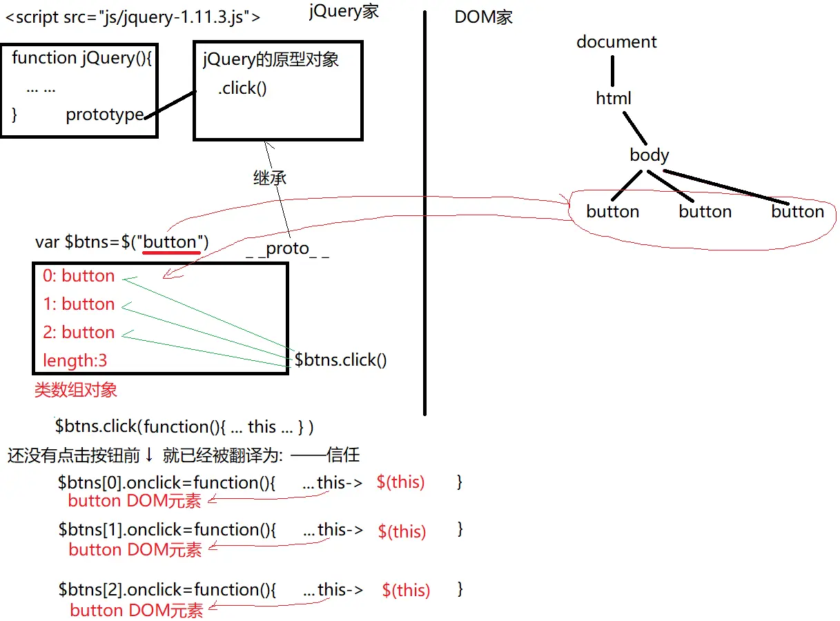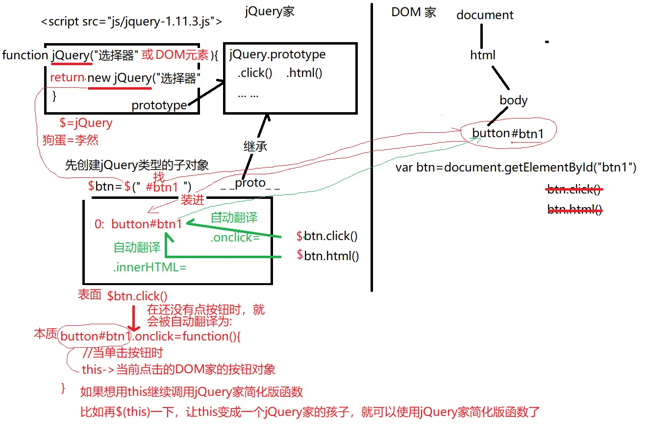 // new jQuery("#btn1"); //2件事儿:创建新子对象和查找DOM元素
