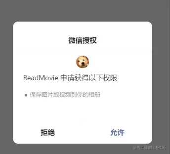 - 如果没有scope.writePhotosAlbum'这个属性,那么说明没有进行权限的询问,执行wx.authorize({ scope: 'scope.writePhotosAlbum'})