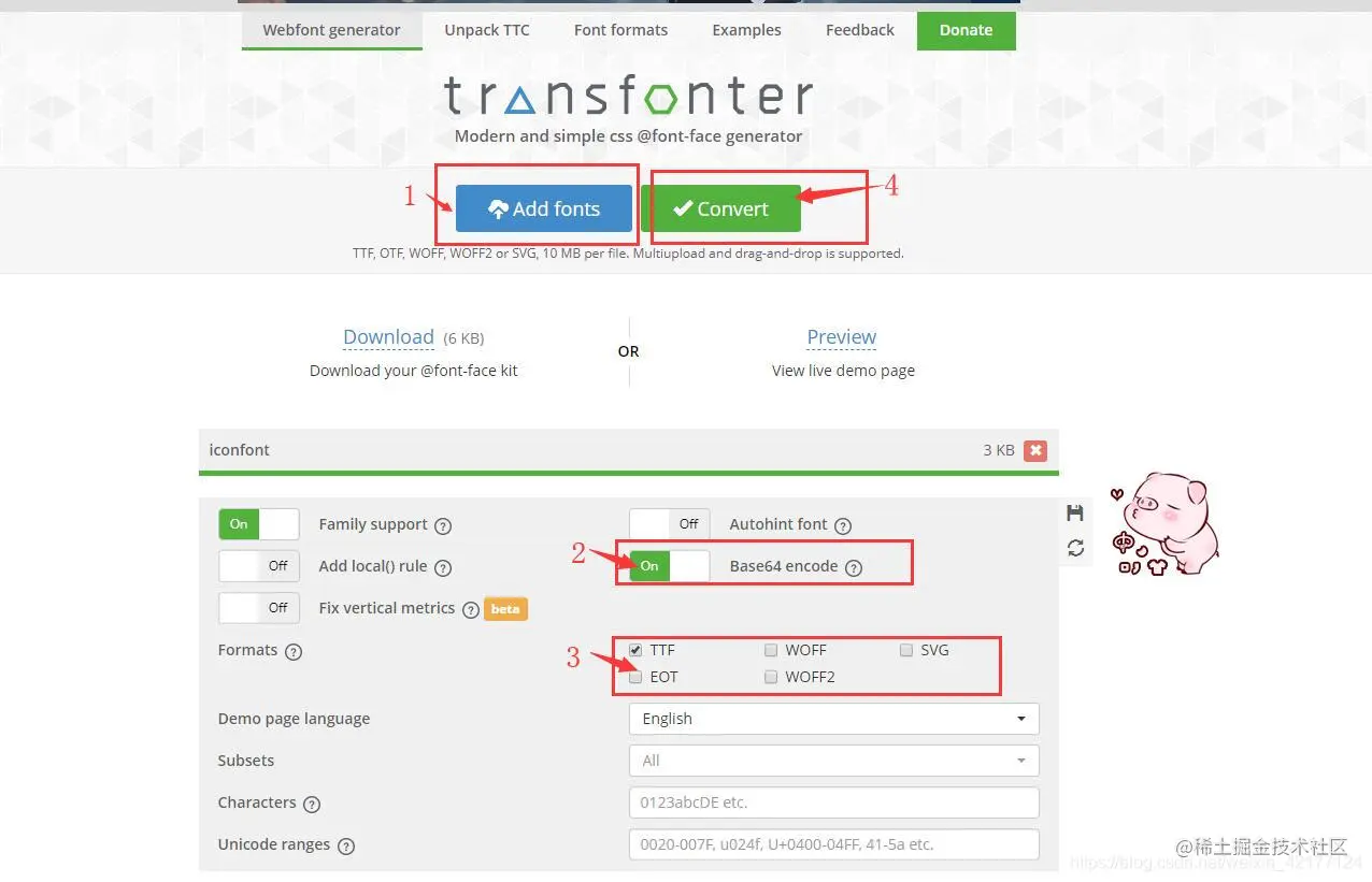 - 通过transfonter.org/ 将.ttf文件转换为base64文件