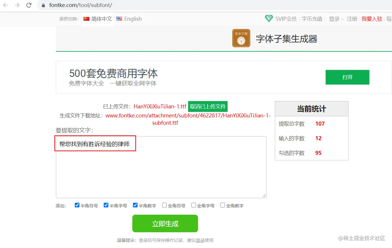 - 一般字体文件太大,我们可以先提取需要的文字样式。www.fontke.com/tool/subfon… 并下载对应的字体文件;