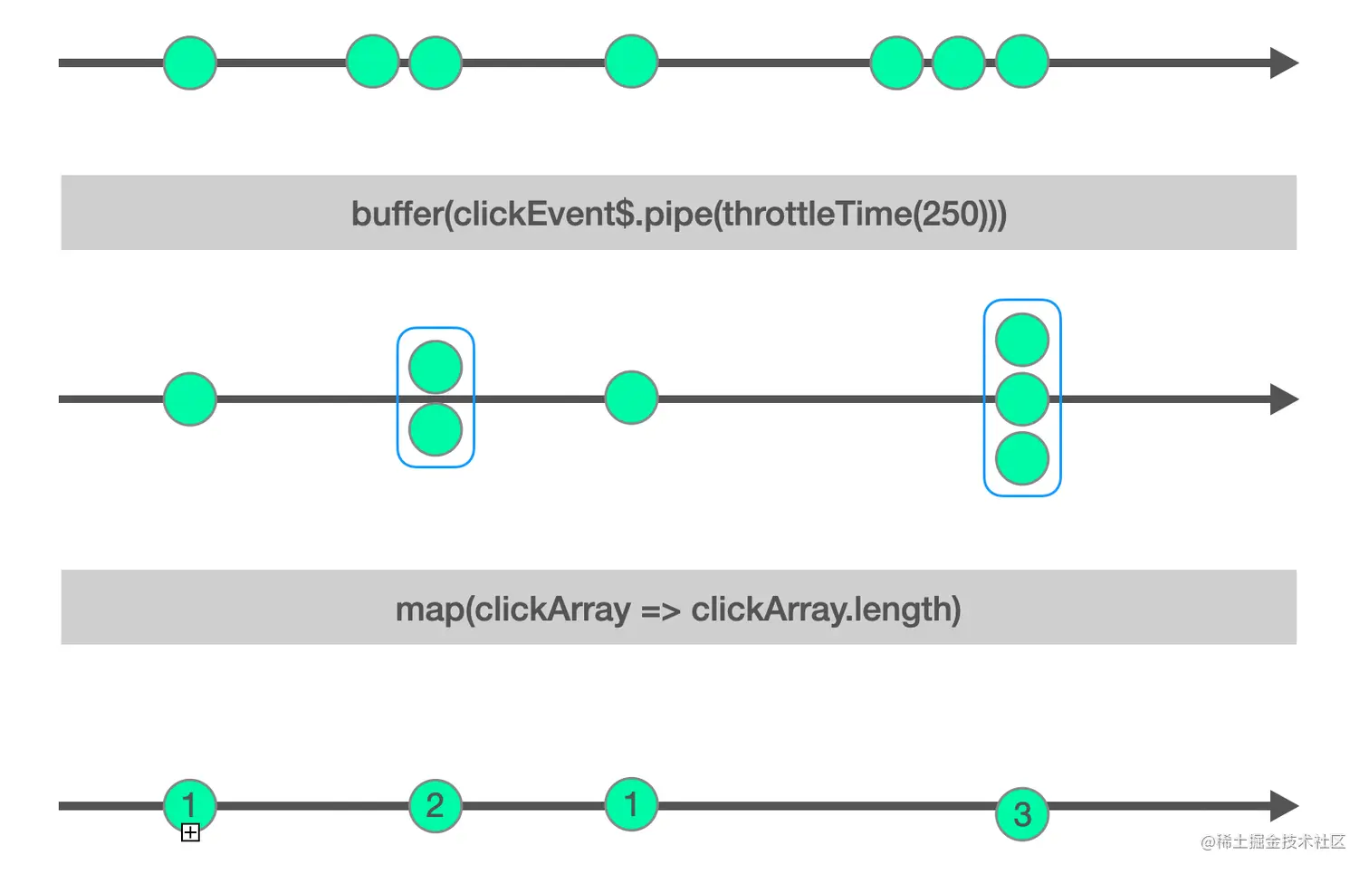 buffer(clickEvent$.pipe(throttleTime(250))).pipe(map(clickArray => clickArray.length))
