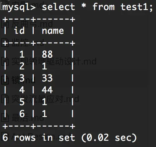 | 6 | select * from test1 where name =1;(显示2 5 6 三条) | |
