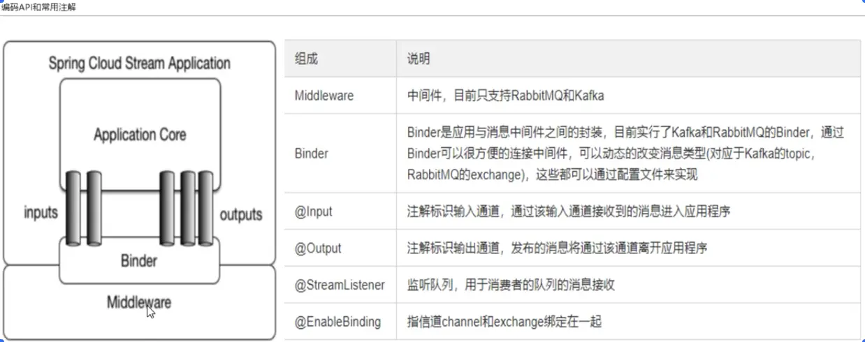 这些中间件的差异性导致我们实际项目开发给我们造成了一定的困扰,我们如果用了两个消息队列的其中一种,后面的业务需求,我想往另外一种消息队列进行迁移,这时候无疑就是一个空难性的,一大堆东西都要推倒重新做,因为它跟我们的系统耦合了,这时候springcloud Stream给我们提供了一种解耦合的方式。