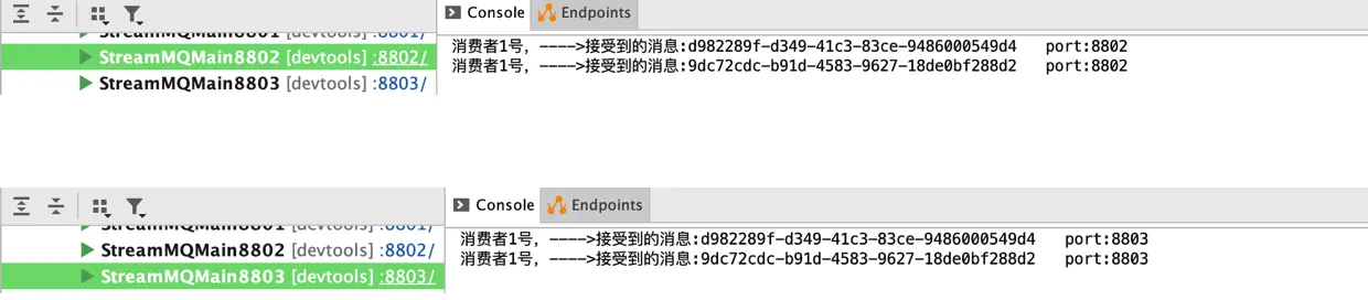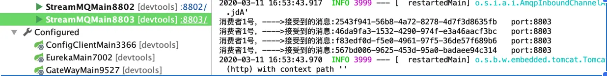 - 最后启动cloud-stream-rabbitmq-consumer8801 /8802/8803