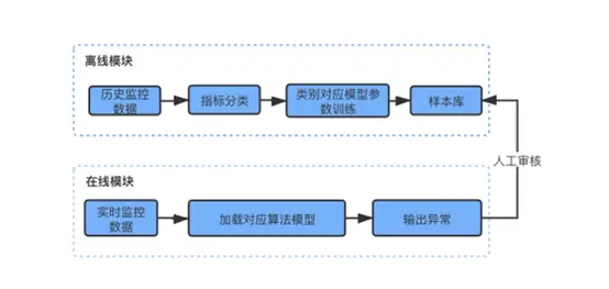 在线模块主要是利用离线模块训练好的模型,对实时产生的监控数据进行检测。判断指标的健康状况期,主要步骤就是以实时监控数据为模型输入,判断指标是否异常,如果异常的话就进行相应的告警。此外,对模型输出的异常提供了一个人工审核的过程,这样的话审核的结果就保存到样本库中。