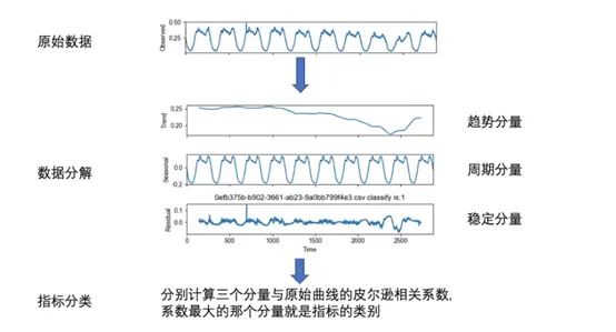 受此启发,我们首先对时序数据进行了分解,之后可以把一个指标分解成趋势分量、周期分量以及稳定分量。然后分别计算这三个分量与原始曲线的一个皮尔逊相关系数,系数最大的哪个分量就是指标的类别。