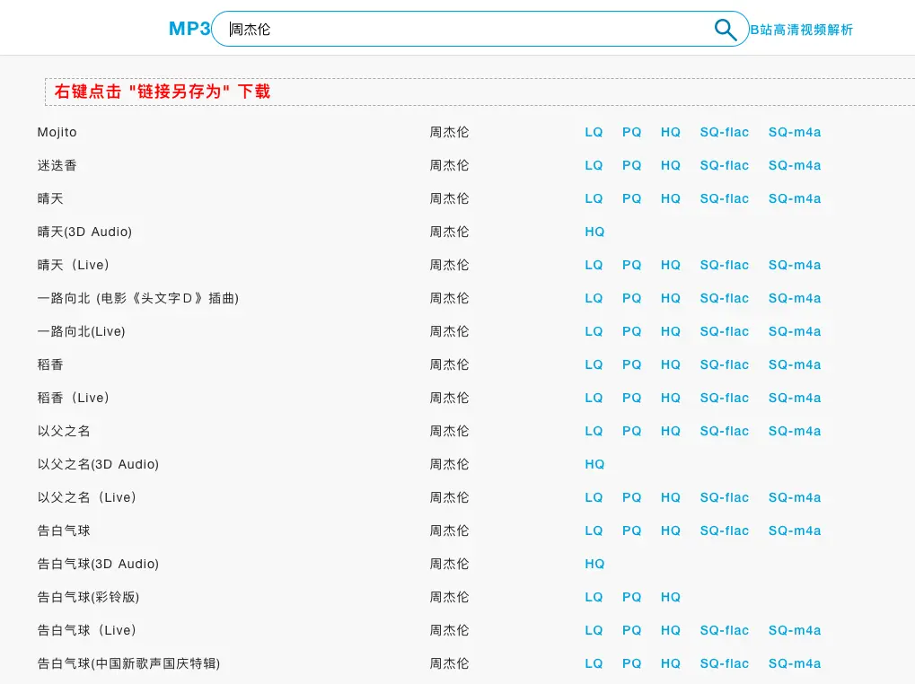 如何下载咪咕的高音质音乐 A坐看风起时 2020-06-21 427 阅读1分钟 打开 萤火虫咪咕音乐无损音乐的网站 https://bilibili.syyhc.com/mp3.html 这是一个解析咪咕音乐直链的网站 简洁 没有广告. 只要输入 想要的歌曲或者歌手 就能搜索到你想要的歌曲 每首歌都有各种音质, 如果想下载 只要点击右键 链接另存为就可以下载了