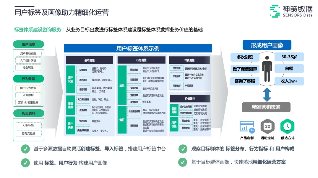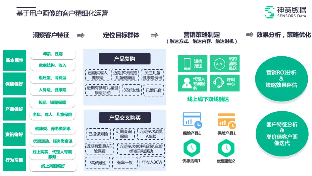 例如,通过保单客户特征分析,支撑市场投放策略优化与业务决策;基于客户线上触点行为的精细化运营策略等。