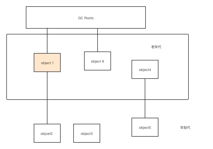在年轻代垃圾收集中,有些对象是直接和gcroot关联的,而有些对象是通过老年代间接的和gcroot关联 如果要在一次young gc中也扫描关联了gcroot的老年代才能进行,那么会增大回收器扫描的效率,如下图所示