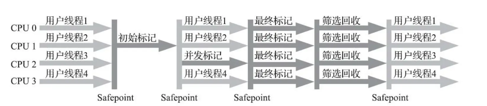 其中需要停顿的是第一步初始标记和第三部重新标记,初始标记是标记gc roots能直接关联到的对象,速度很快 并发标记阶段就是从GC Roots的直接关联对象开始遍历整个对 象图的过程,这个过程耗时较长但是不需要停顿用户线程,可以与垃圾收集线程一起并发运行; 而重新标记阶段则是为了修正并发标记期间,因用户程序继续运作而导致标记产生变动的那一部分对象的标记记录,前边有讲过cms是采用增量更新的方式处理的,这段的停顿时间稍长;最后是并发清除阶段,清理删除掉标记阶段判断的已经死亡的 对象,由于不需要移动存活对象,所以这个阶段也是可以与用户线程同时并发的。