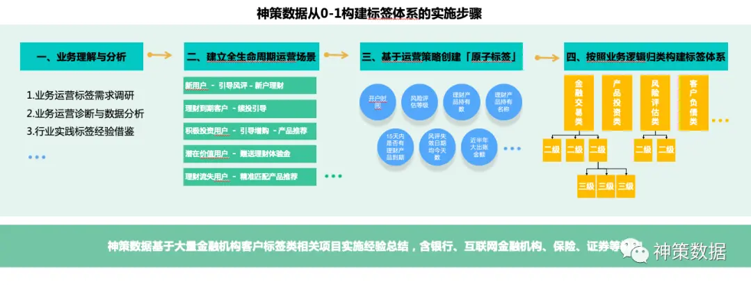 比较合理的标签流程构建分为四个步骤,分别是业务理解与分析、梳理全生命周期运营场景、创建原子标签、归纳成体系。