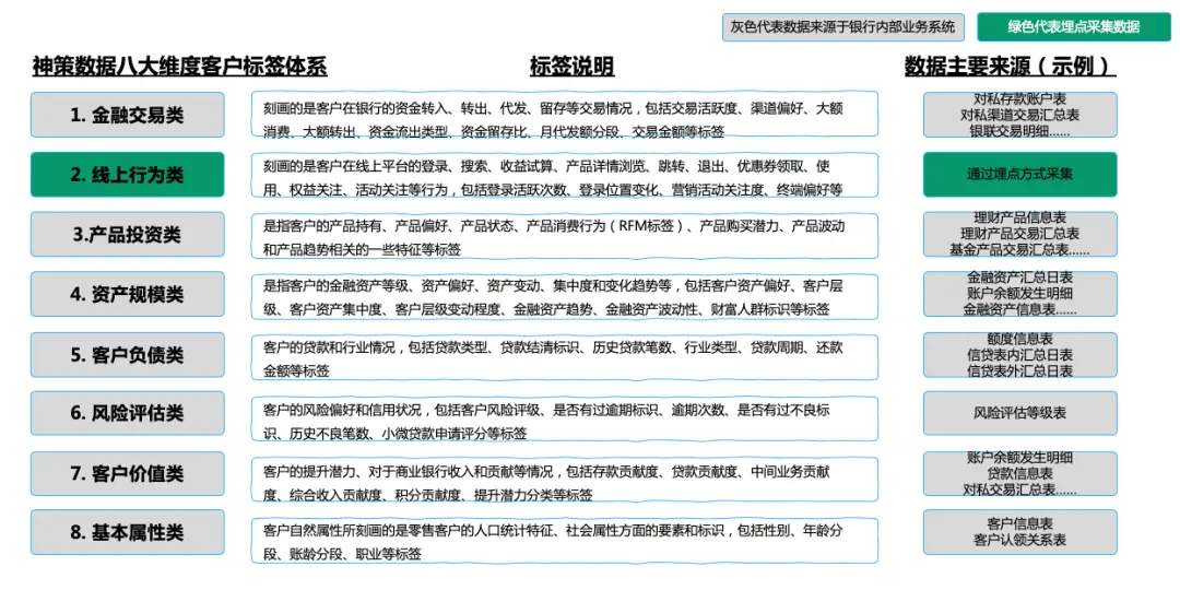 基于近 200 家金融机构数据化实践经验,神策数据沉淀出八大维度的客户标签体系,包含金融交易类、线上行为类、投资产品类、资产规模类、客户负债类、风险评估类、客户价值类、自然属性类,从银行目前标签构建现状来看,普遍线上行为类标签构建比较薄弱。神策数据标签体系说明如下: