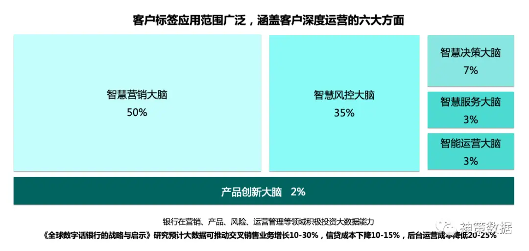 第三,缺少客户标签管理中台。有些银行投资重点仍在新核心等系统方面的建设,数据化转型的数据中台建设尚处于规划中。例如某城商行缺少标签系统,客户大额资金动账类信息无法及时传递到前台,客户经理很难掌握关键营销机会,导致该行资金流失严重,80% 客户最终成为低价值客户。