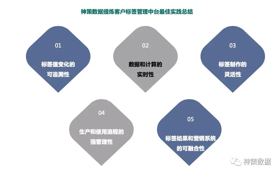 标签平台是发挥客户标签价值的保障,从业务运营高效支撑以及标签生命周期管理出发,标签系统应具备标签自助创建功能、标签实时计算、标签体系及结果可视化、历史标签查询、标签生命周期管理、权限管理、标签导入/导出等关键能力。行业实践总结,优秀的客户标签管理平台具备五大特征: