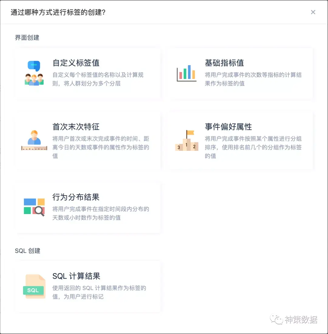 为了满足业务人员对标签创建以及灵活迭代的需要,神策数据标签系统提供了可视化标签创建界面,并且内置六种创建标签方法,可满足业务人员对绝大部分标签构建与使用的需求。为便于理解,对不同方式创建标签进行举例说明: