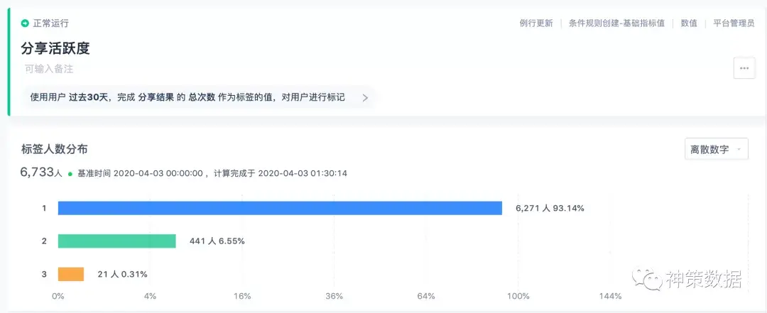 是指将用户完成事件的次数等指标的计算结果作为标签值的创建方式。举例:通过客户分享活动页面的次数创建客户分享活跃度标签。