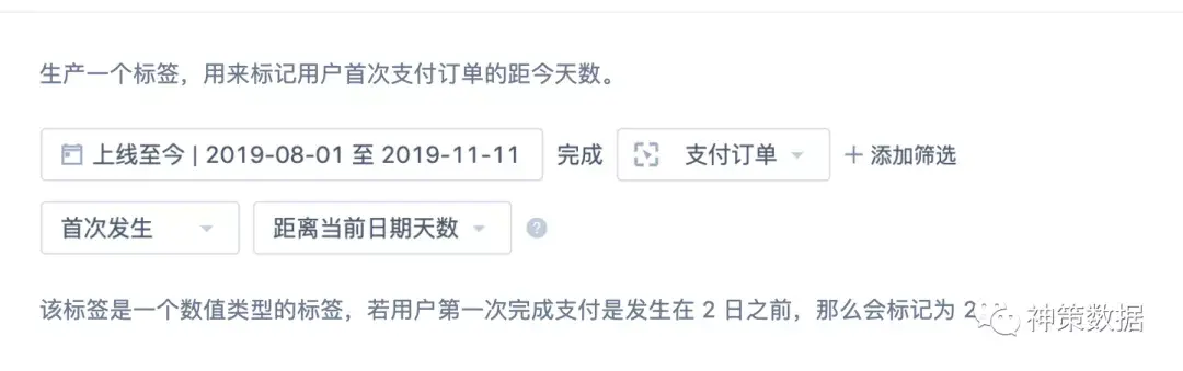 是指将用户首次或末次完成事件的时间、距离今日的天数或事件的属性作为标签的值进行标签创建。举例:构建一定时期内首次完成理财购买距当前日期的天数的标签。