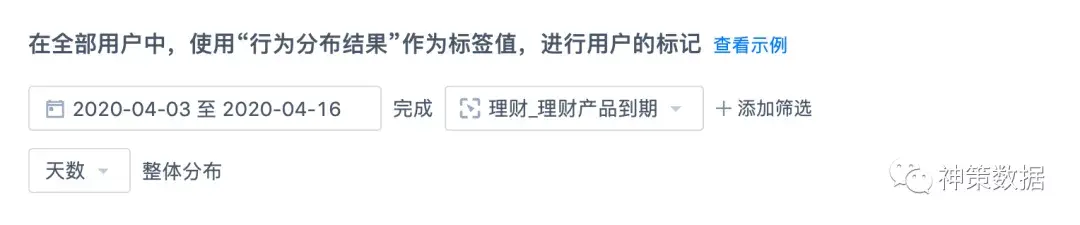 是指将用户完成事件在指定时间段内分布的天数或小时数作为标签值的方式进行标签创建。举例:未来一段时间内理财产品即将到期的天数。