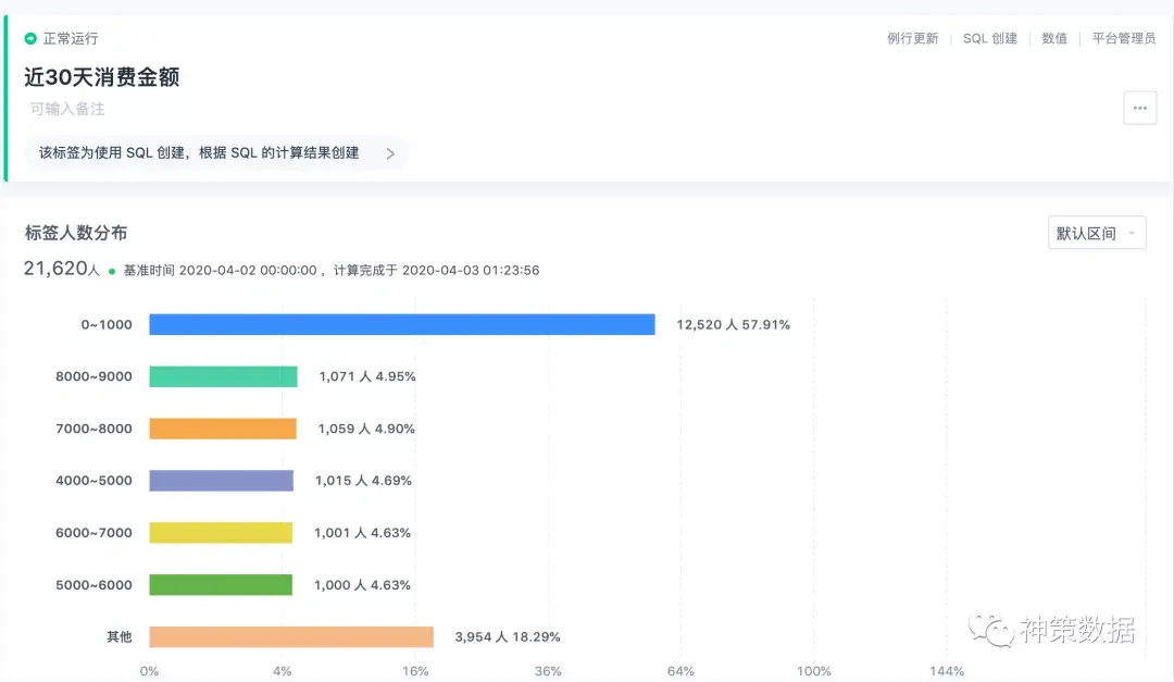 是指使用返回的 SQL 计算结果作为标签的值,为用户进行标记。举例:近 30 天内消费金额分档。