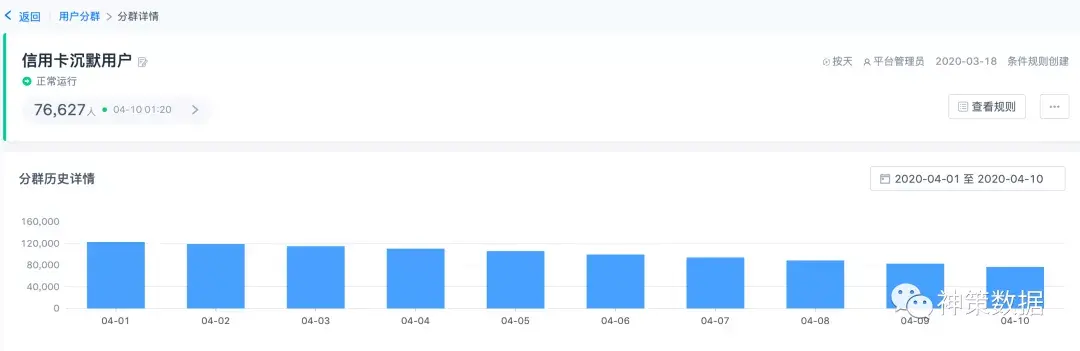 在创建完标签后,经常需要根据标签进行客户分群,查找所需要的目标客群,神策标签平台可以灵活、便捷地构建分群,同时支持画像分析,使业务人员更加快速地掌握特定客群特征,增强认知,为后续营销策划提供方案支持,以下是信用卡沉默用户分群后每日客群规模分析数据。