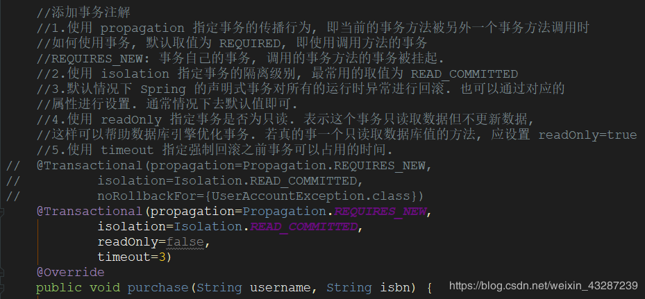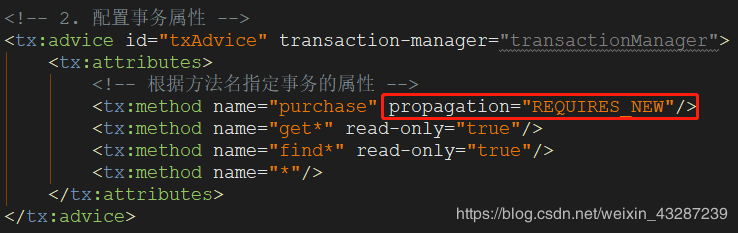 <tx:method name="purchase" propagation="REQUIRES_NEW"/>