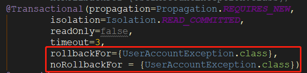 rollbackFor和noRollbackFor属性来定义,这两个属性被声明为 Class[] 类型的,因此可以为这两个属性指定多个异常类 - 遇到