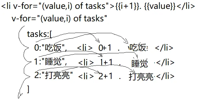 <!--因为要根据数组tasks的内容反复生成多个相同结构的li元素,所以应该在li元素上用v-for-->